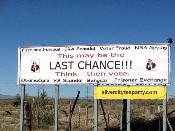 Silver City Tea Party puts up this billboard decrying 'IRA', 'Bengazi' scandals HT @michaelcoleman:pic.twitter.com/mH18JKjzgA