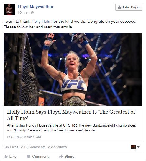 New @UFC champ and #ABQ hero @HollyHolm gives props to @FloydMayweatherpic.twitter.com/1ZIJl1lDda
