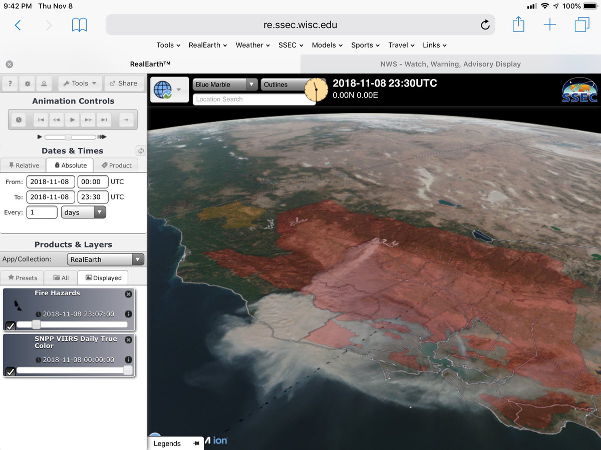Interactive Globe View of the #Campfire today 11/08 #SNPP #VIIRS TrueColor (TC) with #NWS Redflag warnings layer stack. See a hi-res version here->https://re.ssec.wisc.edu/s/eXw1Y #RealEarth™ #UWSSEC #UWCIMSSpic.twitter.com/d9fMdrMJl2