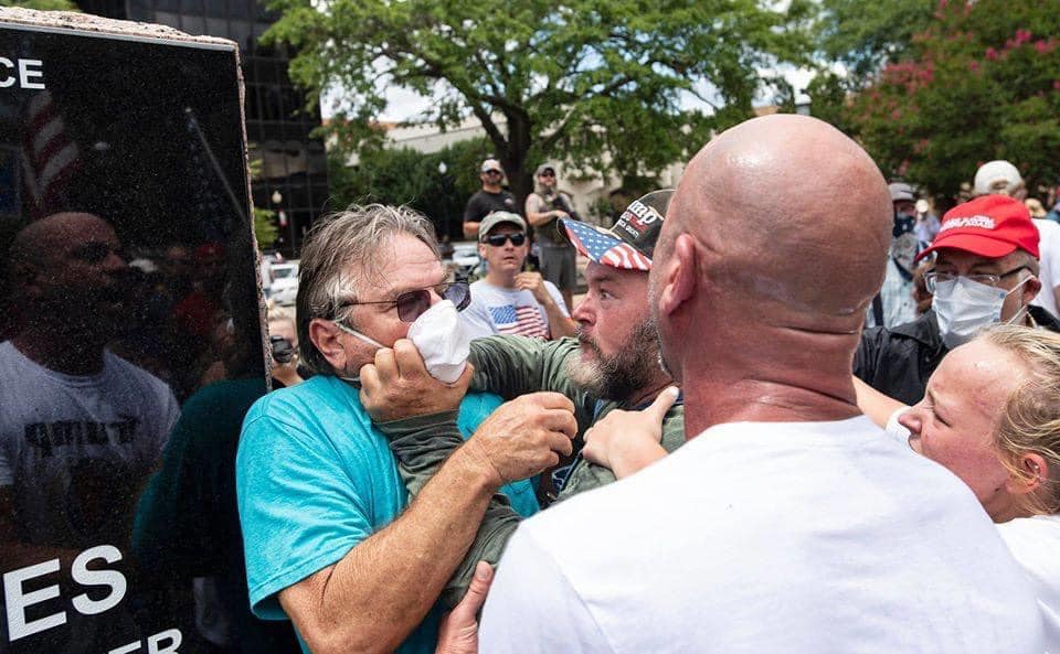 The guy doing the choking is wearing a Trump hat. I don’t think anyone finds this surprising.