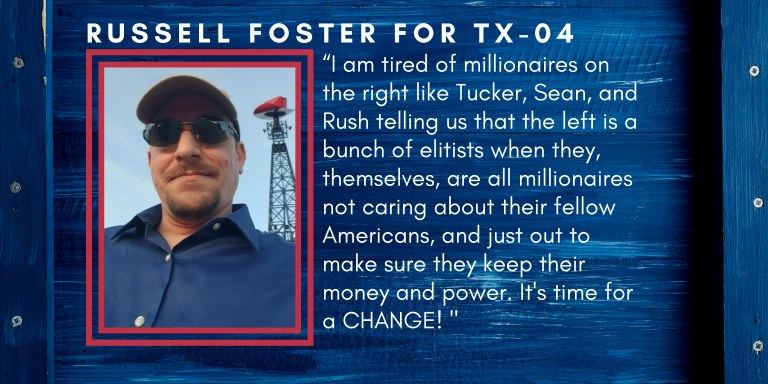 TX-04 Have you met Russell Foster yet? https://foster4texas.com/  He is a native Texan from TX-04 running to fill the seat that was vacated when John Ratcliffe became DNI His opponent is a Libertarian, born in MA and ran for office in NYC. Hmm 🤔 #ONEV1 #BlueDot @RussellFosterTXpic.twitter.com/7ecdkS1bzF