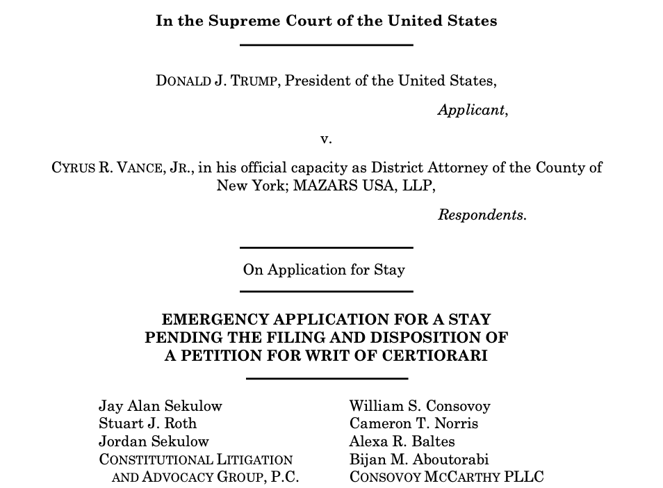 NEW: Trump lawyers have asked the Supreme Court for an emergency stay to block Manhattan prosecutors from accessing Trump's personal financial info. pic.twitter.com/e6GGIRS903
