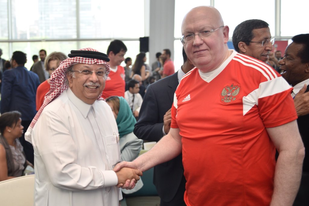 #WorldCupRussia2018 opening match: Amb. of Saudi Arabia 🇸🇦 Abdallah Y. Al-Mouallimi congratulates Amb. #Nebenzia on victory! We believe in a fair game! @ksamissionun #WorldCup2018 #Russia2018WorldCup #Russia2018pic.twitter.com/SRTPc62zIg
