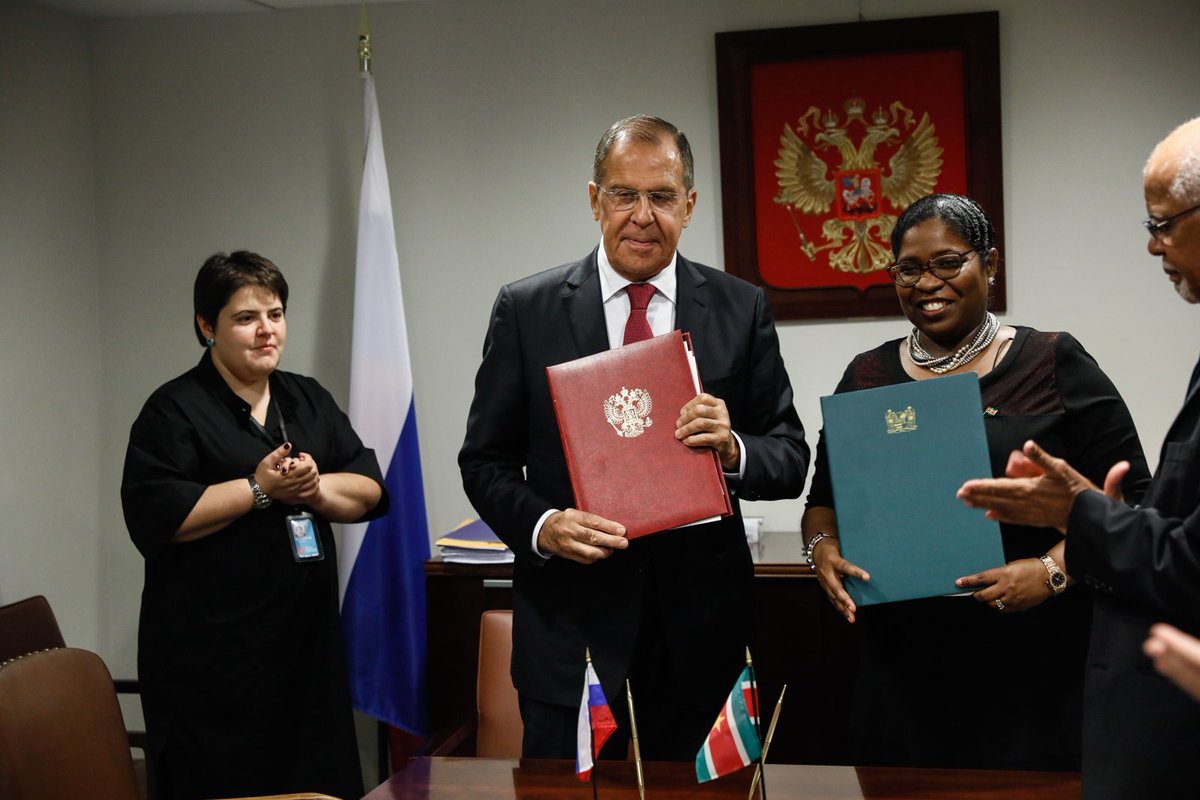 Sergey #Lavrov and his colleague Yldiz Pollack-Beighle of #Suriname signed an intergovernmental agreement on the conditions for waiving visa formalities in the mutual visits of the citizens and the Memorandum of Cooperation Foreign Ministries of their countries. #UNGA #UNGA73pic.twitter.com/nJSLPD29Hk