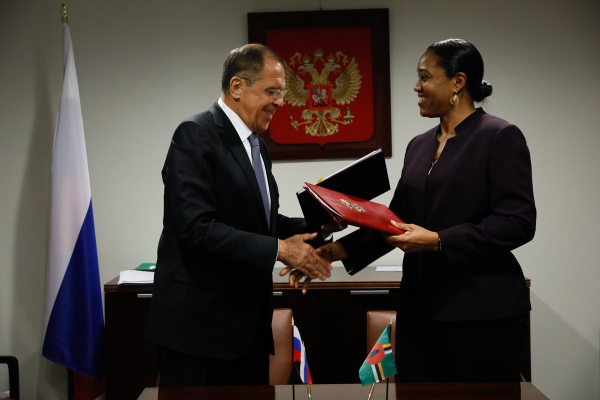 Sergey #Lavrov and FM of the Commonwealth of #Dominica Francine Baron met on the sidleines of the #UNGA. The parties sign the Treaty on the fundamentals of relations between the two countries and the Agreement for waiving visa formalities in the mutual travel of citizens.pic.twitter.com/GytzyRtXGt