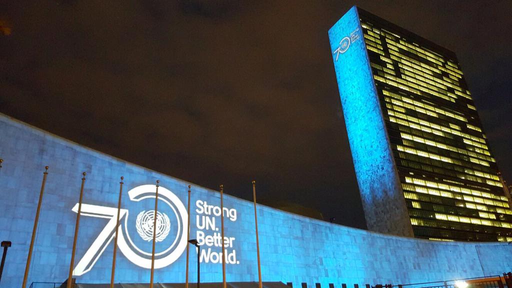Праздничное световое шоу на штаб-кв #ООН:Цели устойчивого развития #SDGs и 70-летие ООН #UNGA @MID_RF @KremlinRussiapic.twitter.com/W0mkZh3gyq
