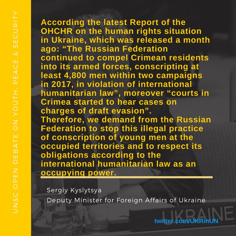 According to @UNHumanRights, the Russian Federation continued to compel Crimean residents into its armed forces, conscripting at least 4,800 men within two campaigns in 2017, in violation of international humanitarian law. DFM @SergiyKyslytsya #UNSCpic.twitter.com/8CchGkdsKc