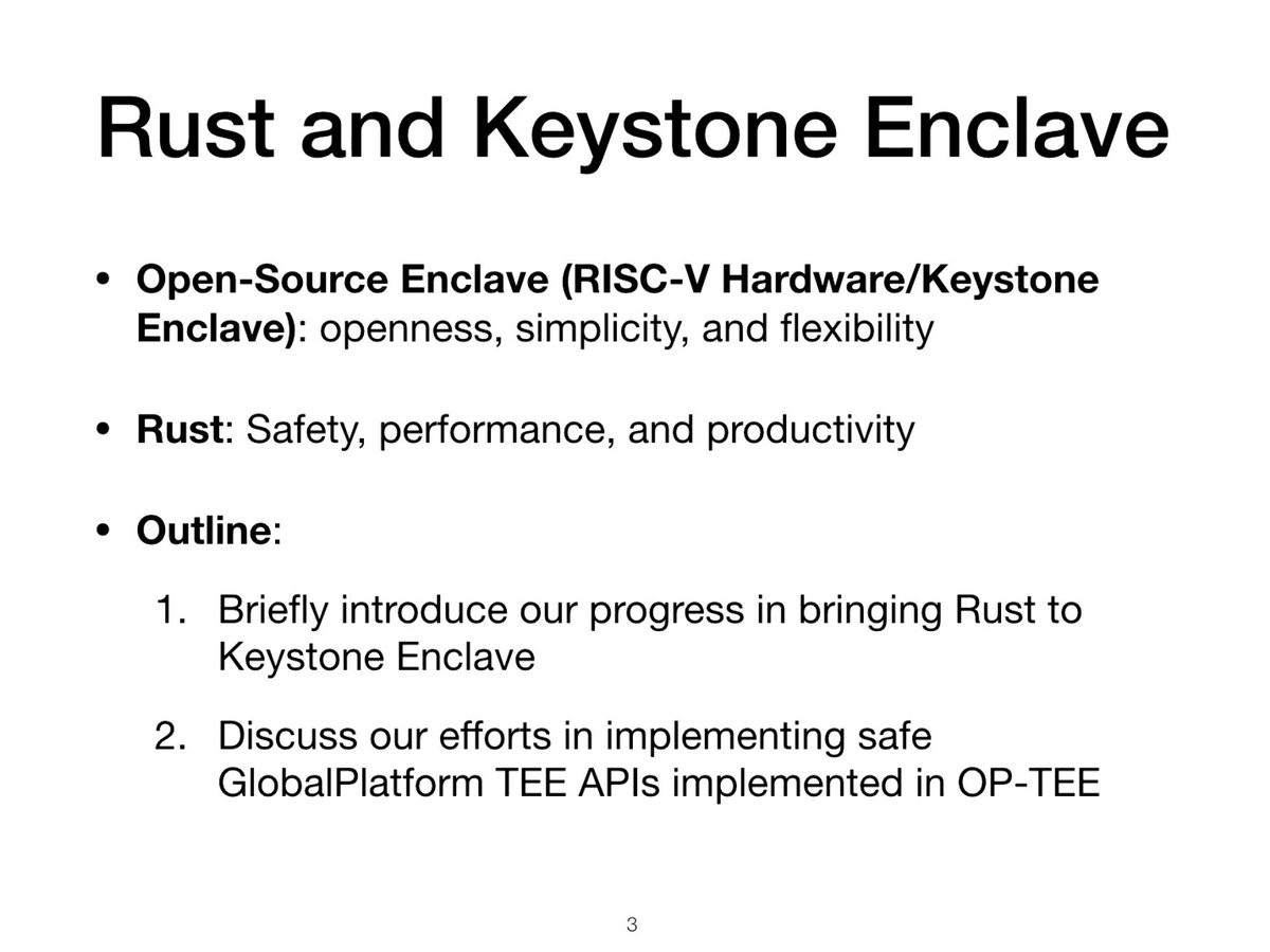 #OSEW2019: https://mesatee.org - a universal trusted execution environment framework developed at Baidu and written in@rustlang. Here are their slides on why they picked Rust:pic.twitter.com/r03c1oqAXo