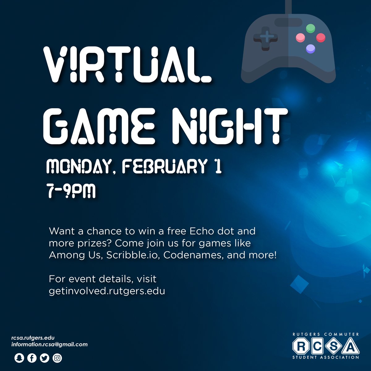 @RUCommuter is hosting a virtual game night featuring Among Us, Codenames, and more. Sound like fun? You can find more information on their page!pic.twitter.com/xa4CPAP4k8