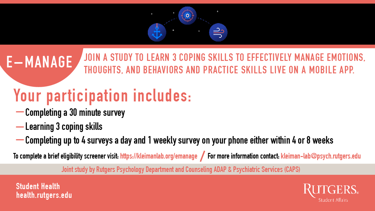 Join a study to learn 3 coping skills to effectively manage emotions, thoughts, and behaviors. Sign up for a 90-min workshop in December. To complete a brief eligibility screener visit: http://go.rutgers.edu/E-MANAGE pic.twitter.com/LYHNMZ7wuO