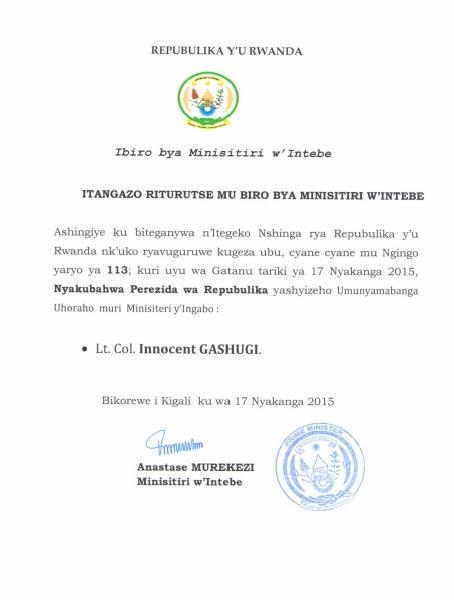 Perezida @PaulKagame yashyizeho Umunyamabanga Uhoraho (PS) muri @RwandaMoD akaba ari Lt Col Innocent Gashugi #Rwandapic.twitter.com/8tEziAbUbq