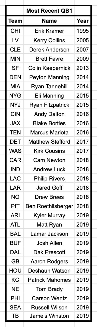 The Bears haven’t had a top-12 FF QB since 1995. The full list of most recent QB1s here:pic.twitter.com/u5SJuqKvIa