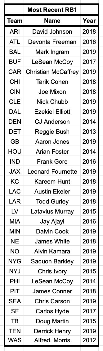 Most RB1 games (2019) 13- McCaffrey 8- Elliott Cook Henry 7- Ekeler Fournette A Jones 6- Kamara Bell Chubb Gurley