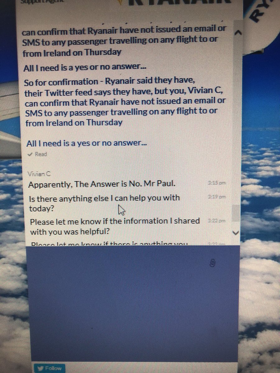 Hey @Ryanair it seems your live chat people don’t agree. No one has been contacted by SMS or email.pic.twitter.com/HyANa0NZDM