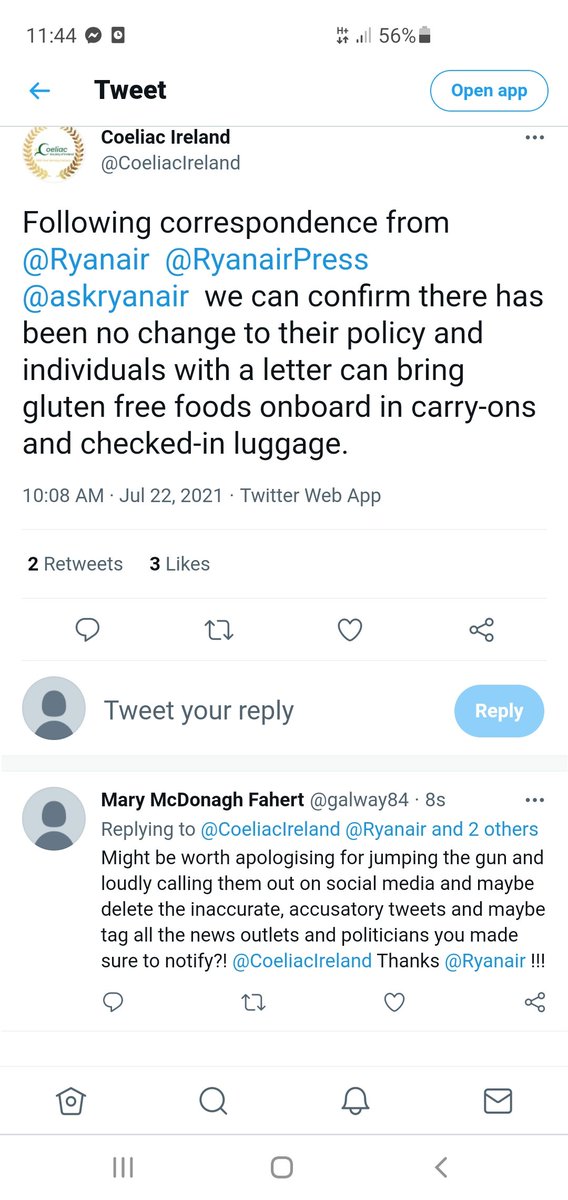 @Ryanair and from us coeliacs we apologise for the coeliac society jumping the gun on their uninformative attack! They've deleted my comment but here it is screenshotted!pic.twitter.com/6Zhaxy3ZRc