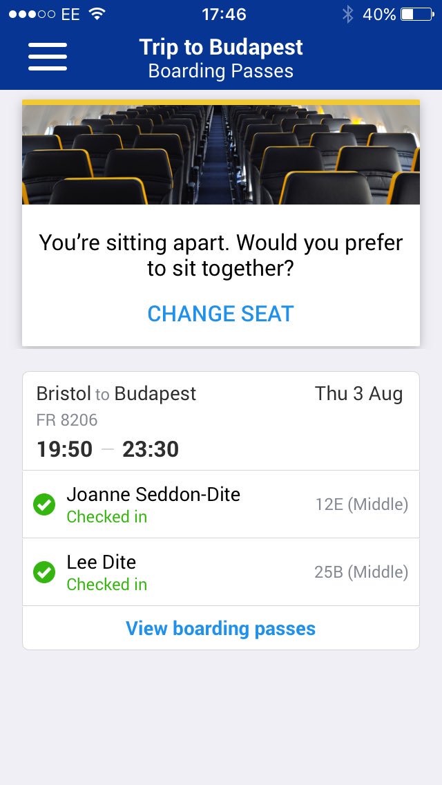 @Ryanair split my husband and I up on our flight when there are vacant seats next to us both, making us pay more £. Awful customer servicepic.twitter.com/2f9WptwE2q