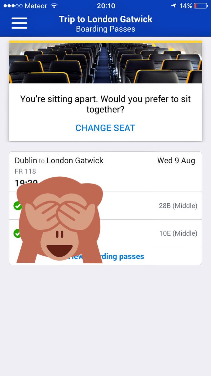 @Ryanair are you having a laugh! You have us 18 rows away from each other! Thankfully we're flying home with @AerLinguspic.twitter.com/iRYk6sXdia