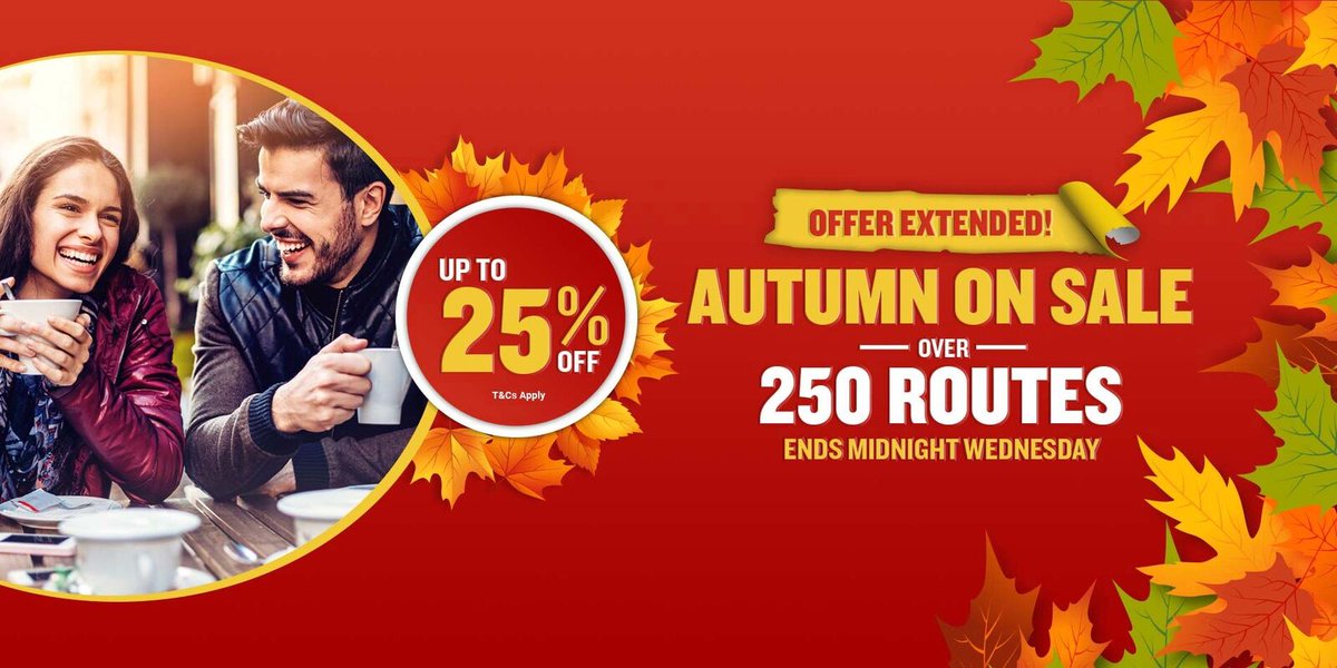 Autumn Sale Extended! Up to 25% Off over 250 Routes! Book by Midnight only at http://Ryanair.com http://bit.ly/2eCatkh pic.twitter.com/6MJj282PoA
