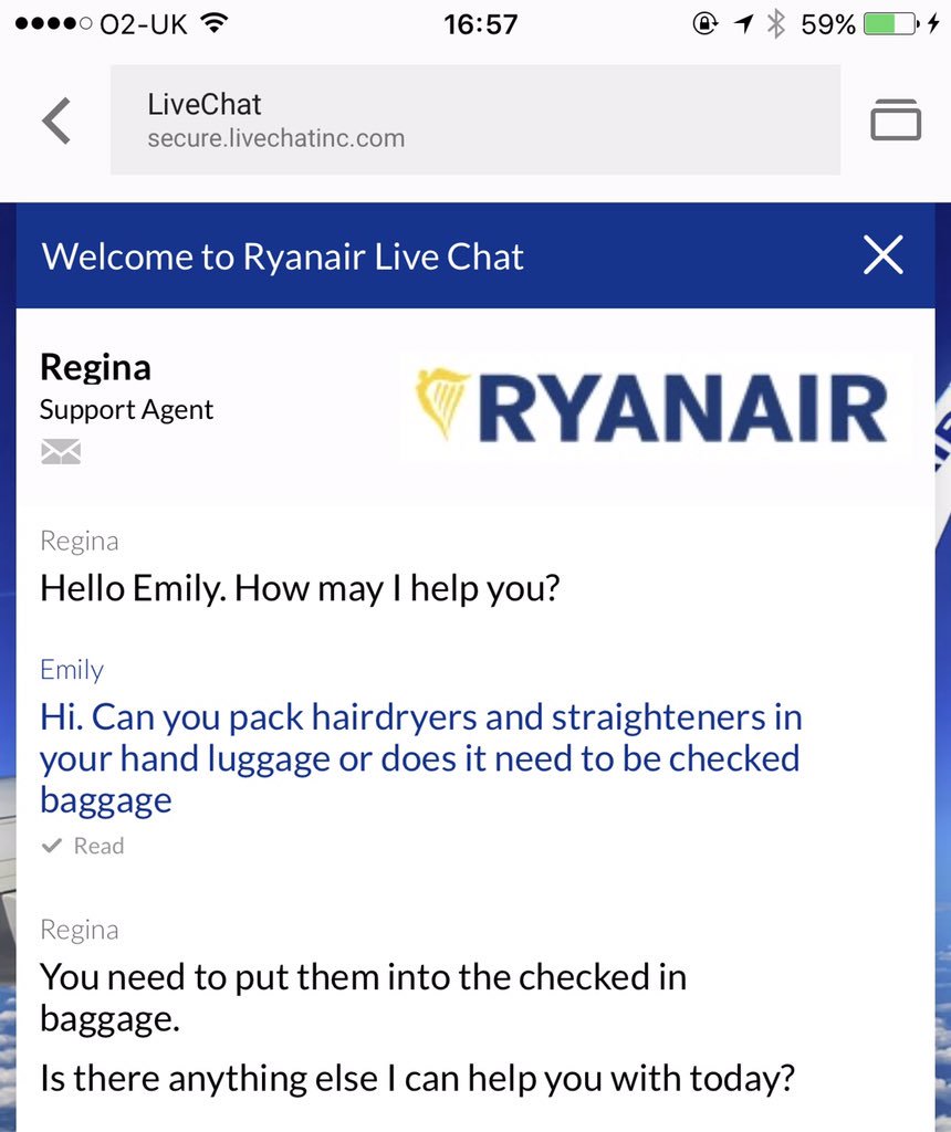 Your online chat told me dryers and straighteners can't go in hand luggage can you confirm who is right??!!pic.twitter.com/LuhSFK4Yle