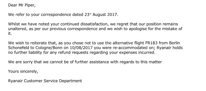 I was told to purchase tickets by ryanair staff and that they would be reimbursed. That's what all this is about. Not the refund.