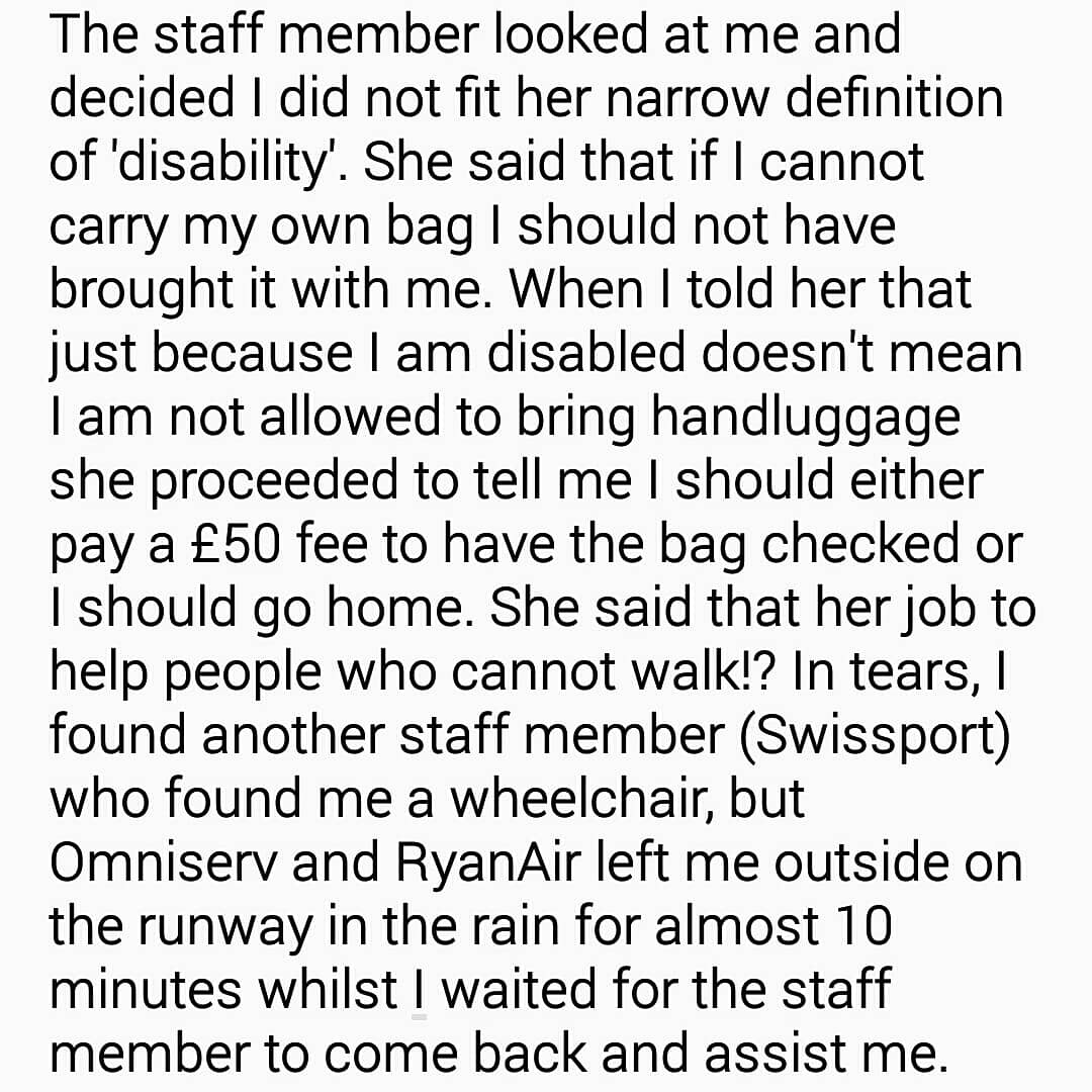 My experience today with @ryanair at @stanstedairport was appalling and heartbreaking that in 2017 companies do not know how to treat customers with basic dignity and rights. Travelling with a disability is hard enough without your poorly trained staff making it imposible.pic.twitter.com/Gqyhrr6jR8