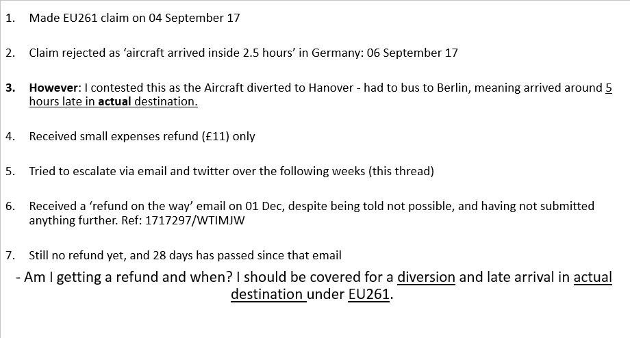 Hi JC/whoever picks this up - It's complicated- have explained it many times to no avail. Please see the image below for clarity - I am waiting for a refund for a STN-SXF flight that was 2.5hrs late & then diverted to HAJ, meaning we arrived in *Berlin by bus 5hrs late* PLS help!pic.twitter.com/8CExiz5eec