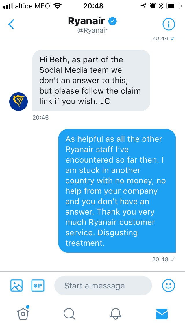 DM’d @Ryanair as stuck in Faro for 3 days due to cancelled flight. No help offered to date AT ALL, nearly £1k out of pocket with new flights/hotel/food all had to be sorted by me personally. All I get is a claim form and the below response. Disgusting.pic.twitter.com/4UWwRSP4wO