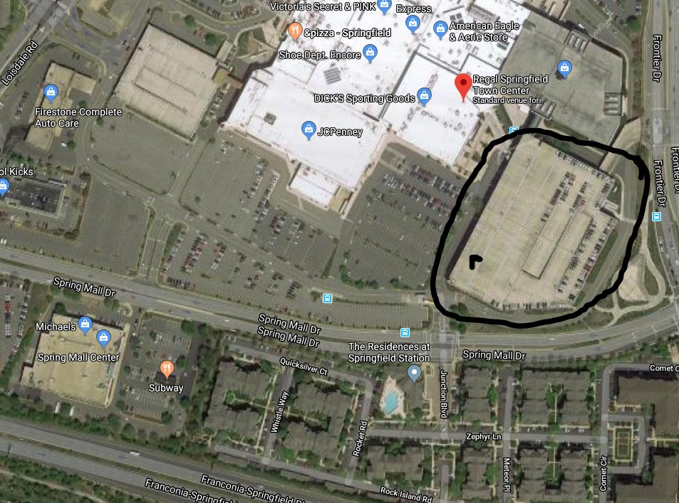 Large garage structure next to the Regal. Note the cars on the rooftop in the sat image. It's during the day-time, probably pre-noon, so a cheap win cause that wouldn't be seen at night. Identifying the time on the shot because of the cars (or lack thereof) around the mall 12/xpic.twitter.com/z6SkBYIvcF
