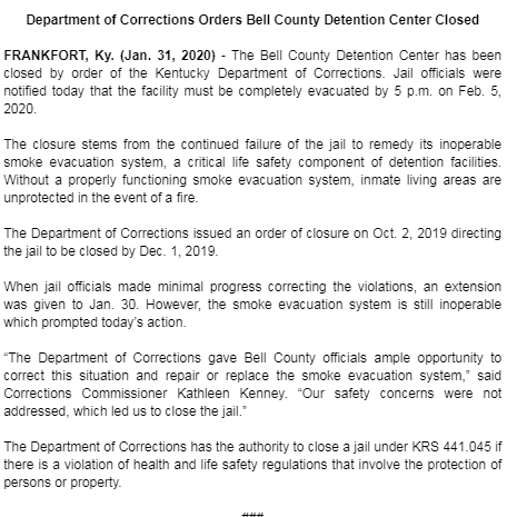 The Ky Department of Corrections has closed Bell County's jail because it hasn't fixed its smoke evacuation system.pic.twitter.com/gvNUupAFF7