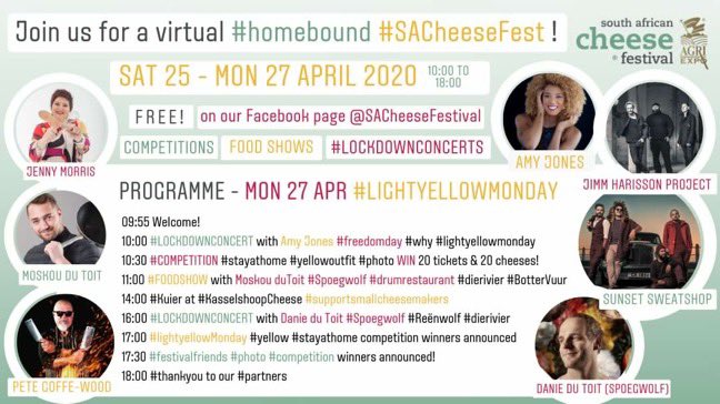 #free#homebound#SACheeseFest! Here is our fun-filled programme for the day - looking forward to virtual shows by@JennyMorrisChef,@PeteGW and@SunsetSweatshop !pic.twitter.com/oy4BLP8D2h