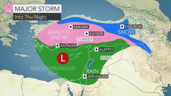 #Syria: Major storm moves SE tonight, unleashing torrential rain and widespread gusts of 65-80km/h and greater locally in#Latakia and#Aleppo. 25-75mm rainfall expected in the west, heading east. Snowfall on the mountainous areas of the SW will be 15cmpic.twitter.com/woncMatMd0