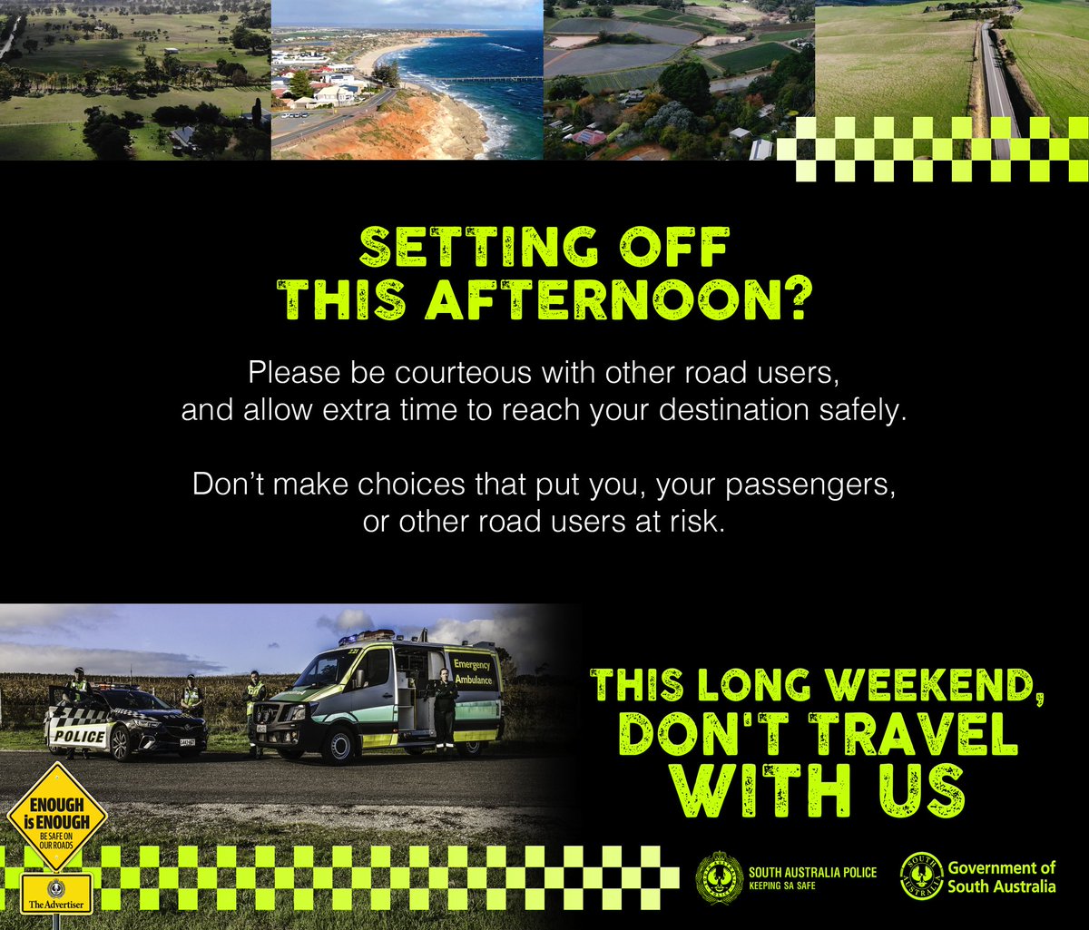 We're reliably informed of higher than usual volumes of traffic departing major metropolitan and regional centres, as many South Aussies head away for a short break. Please be patient out there, allowing plenty of time to reach your destination!pic.twitter.com/tLKZ1DpTEd