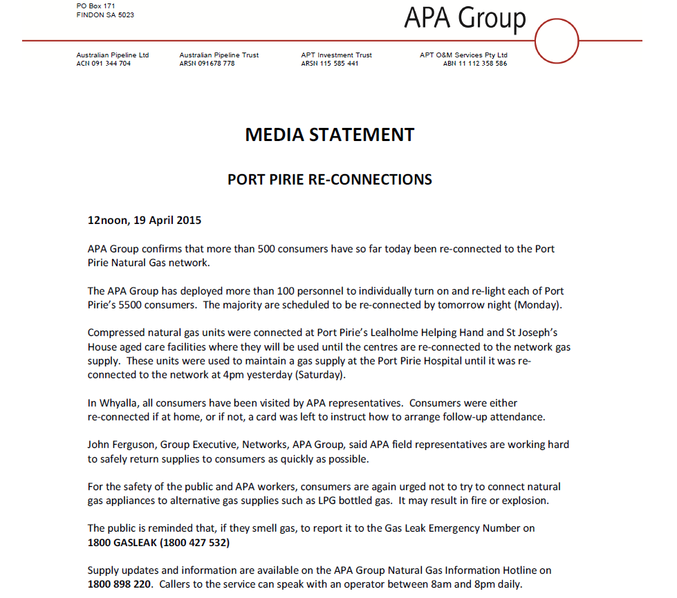 Latest media release from APA Group regarding the re-connection of gas in #PortPirie and #Whyallapic.twitter.com/FIjXG7iUIR