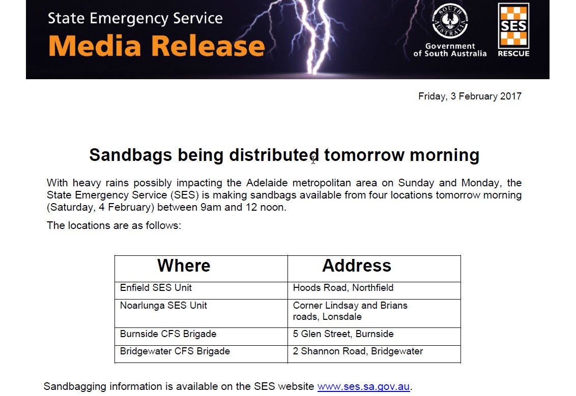 See SES information about where you can collect sandbags tomorrow.https://twitter.com/SA_SES/status/827397479511437313 …