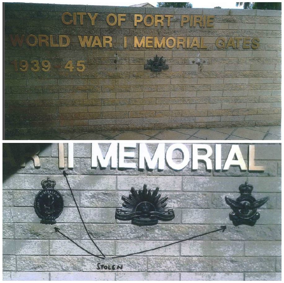 Brass emblems were stolen from a War Memorial at #PortPirie - contact Crime Stoppers with any info https://www.police.sa.gov.au/sa-police-news-assets/yorke-mid-north-local-service-area/brass-stolen-from-war-memorial …pic.twitter.com/M4pJDPE9VE