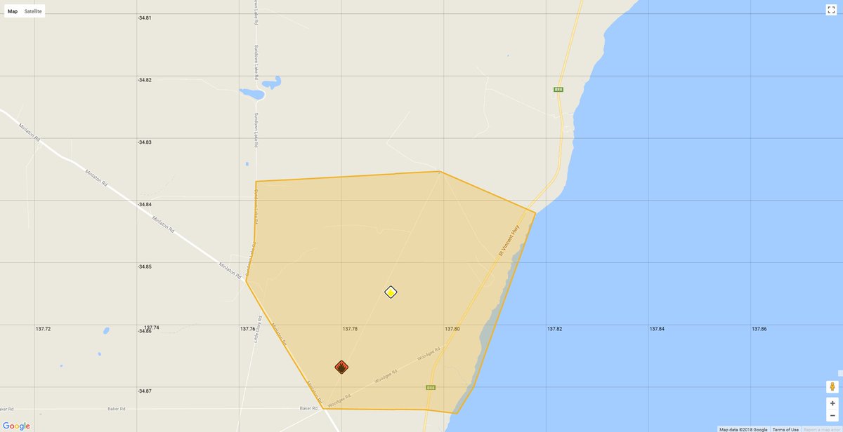 CFS Advises that a bushfire on the Yorke Peninsula approx 3km north of the #Stansbury township has eased however the fire is not yet contained. St Vincent Highway has been reopened, but speeds have been reduced to 25km/h. Please take care if you are travelling in the area.https://twitter.com/CFSAlerts/status/983219947886166016 …