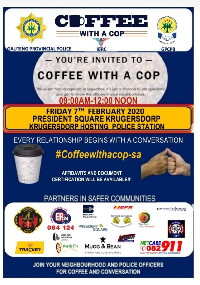 Coffee with a Cop at President Hyper Kruegersdorp..., come and share a cup of coffee with your DPC Maj-Gen Kekana & the Provincial leadership with the local neighbourhood building relationships....