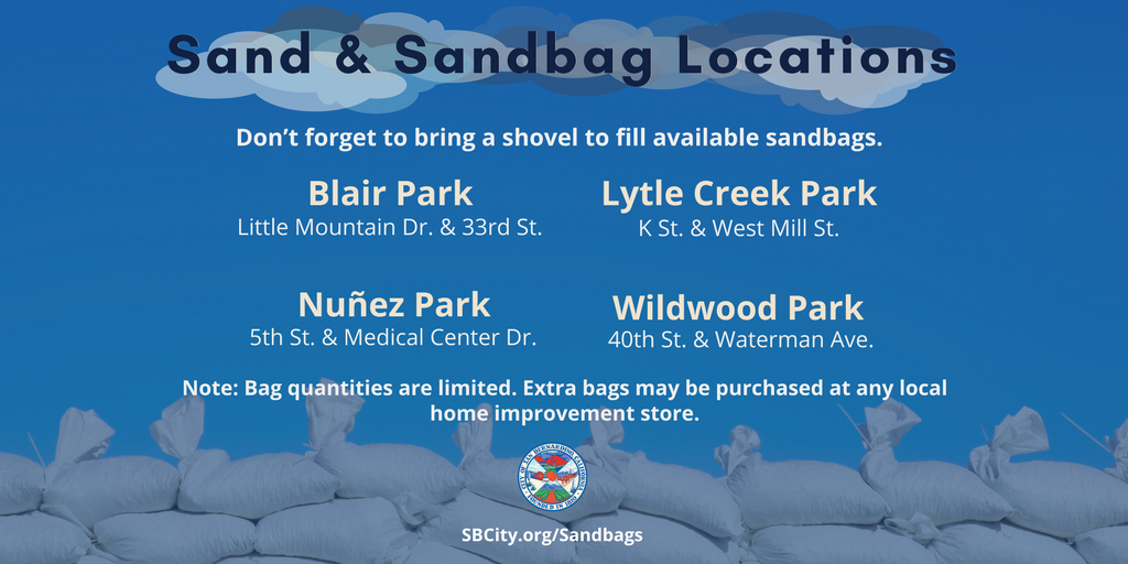 Heavy rain is in the forecast. Free sand and bags are available for San Bernardino city residents at Blair Park, Lytle Creek Park, Nunez Park and Wildwood Park (while supplies last). Don't forget to bring a shovel and gloves to fill bags!pic.twitter.com/vuZLA4vMwv