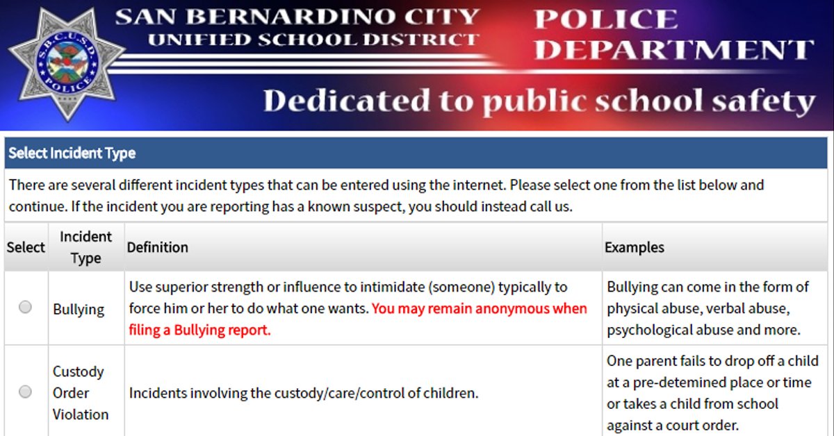 @SBCUSDPOLICE and the Youth Services Division have a new way to report crime and bullying online. This web based reporting system will allow you to file online reports for minor crimes and much more.#SBCUSD https://secure.coplogic.com/dors/startreport/194497000 …pic.twitter.com/xh8sy8IfWJ
