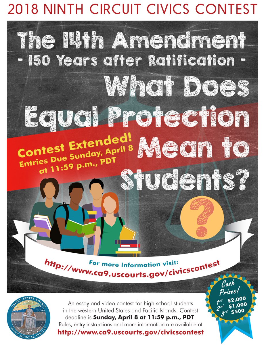 Cash prizes for winners of essay and video competitions! The contest challenges students to write an essay or produce a video, and the 2018 Ninth Circuit Civics Contest focuses on equal protection and schools. More information at http://www.ca9.uscourts.gov/civicscontest/ pic.twitter.com/XmX3zLEXYz