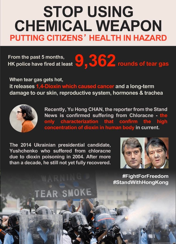 Hong Kong police fire tear gas which would release dioxin towards protestors.