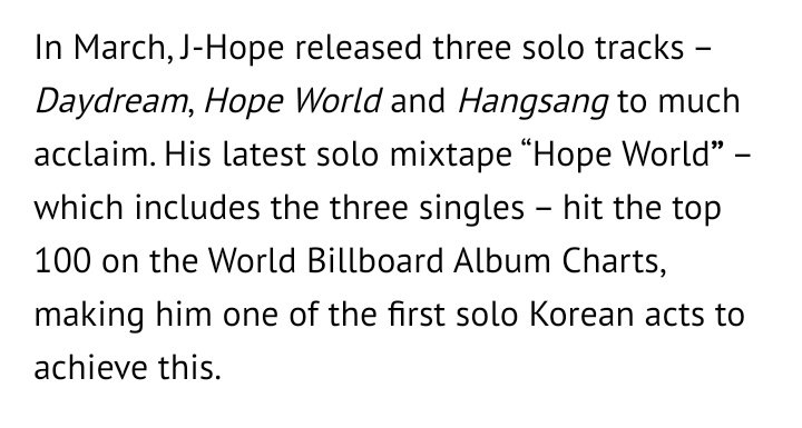 #2, before he was moved to BigHit in 2011, Hoseok had auditioned for and was a trainee under jyp #3, Hoseok released an mixtape/EP, with seven tracks, with two singles Daydream & Airplane, which both have music videos, and he is the highest charting solo Korean act on the bb200pic.twitter.com/pwOIgTpzSu