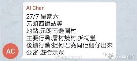 protesters just confirmed another round of violent 'march' to Yuen Long. It says clearly in this screenshot: 27th Jul, Saturday, MTR station of West Yuen Long. target: Yuen Long village. goal: massacre the village and burn it down, deconstruct family temples. Capture Mr Ho.pic.twitter.com/sJOBc8CzgI