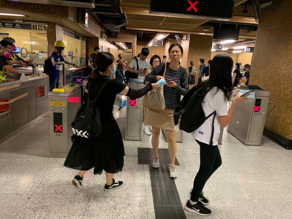 #LIVE: Protesters are helping MTR staff at Sheung Wan station spread information about a safe exit away from tear gas and police operations. "All exits are closed now, please leave via exit D." Others distribute masks to passengers. http://sc.mp/ecki #728protestpic.twitter.com/3pHST81ug2