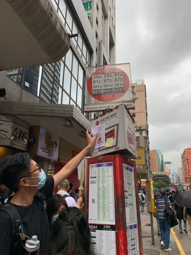 #LIVE: A protester puts Post-it notes on a bus stop urging people to join a citywide strike planned for Monday http://sc.mp/8xoz #hongkongprotestspic.twitter.com/cP3RVThtTw
