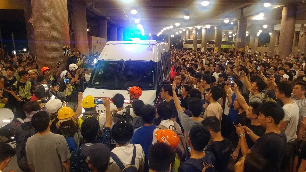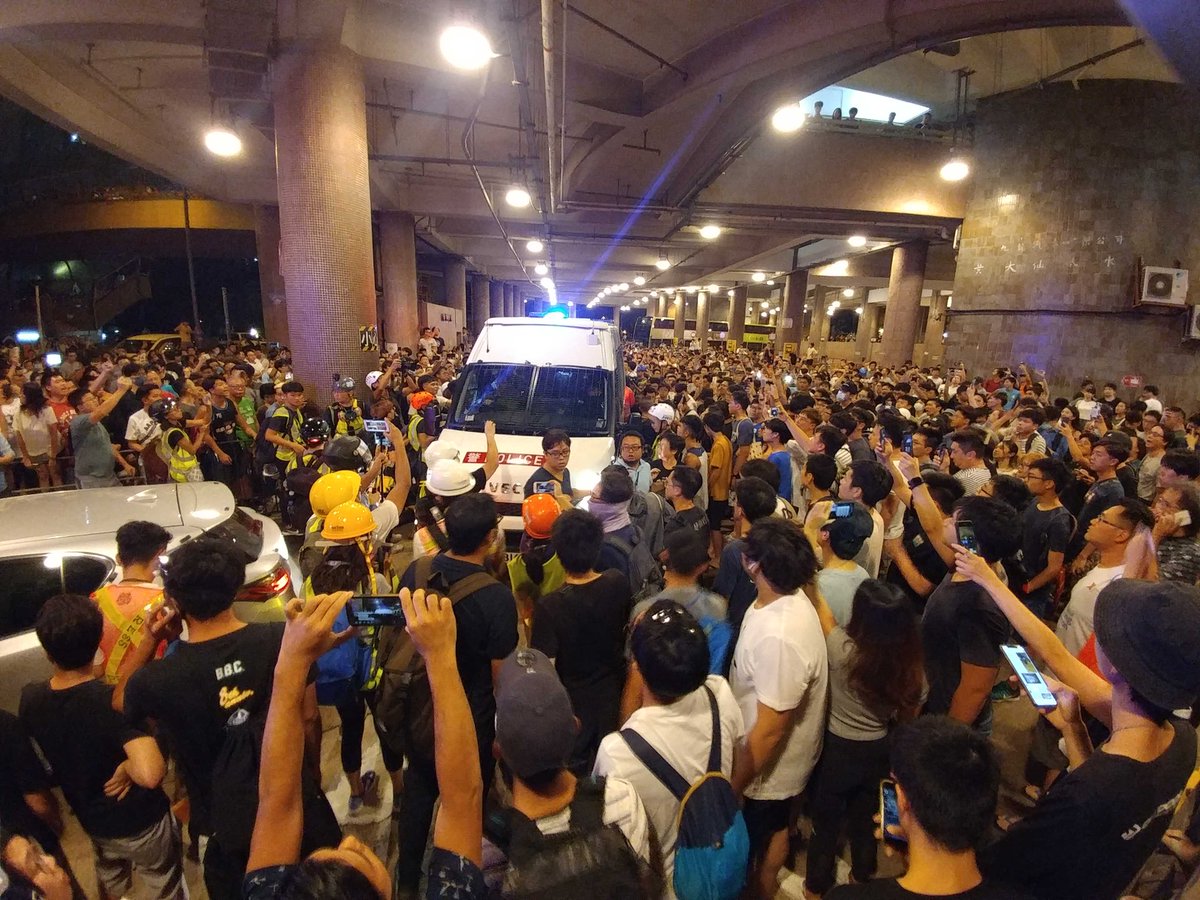 #LIVE: About 300 to 400 residents and protesters are blocking a few police vehicles from leaving Wong Tai Sin. They are surrounding the vans, believed to be holding suspects who were arrested earlier http://sc.mp/8xoz #hongkongprotestspic.twitter.com/pT5tePHX6W