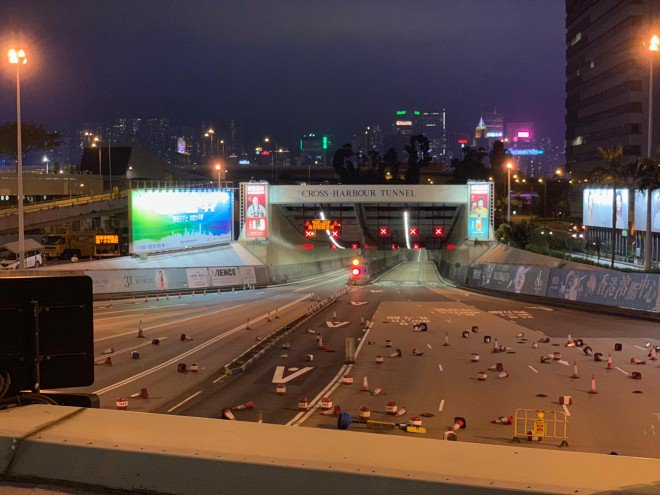 #LIVE: Protesters have dumped traffic cones all over the road in front of the Cross-Harbour Tunnel, and are now heading towards the shopping hub of Tsim Sha Tsui and main thoroughfare Nathan Road. http://sc.mp/h6hv  #hongkongprotestspic.twitter.com/fD8uRgA8UH