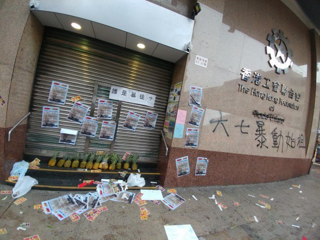 #LIVE: The Hong Kong Federation of Trade Unions issued a statement condemning radical protesters who damaged its workers' club in the afternoon, including spraying engine oil at its logo and the gate, throwing eggs and laser pointing http://sc.mp/2r6q  #hongkongprotests