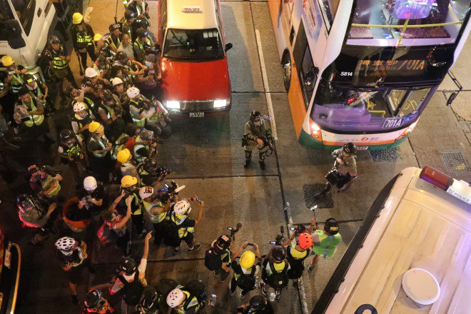 #LIVE: Riot police have stopped advancing and got into police vans at the junction of Nathan Road and Waterloo Road. Soon after, the vehicles leave the scene http://sc.mp/2r6q#hongkongprotestspic.twitter.com/rsIs2jSPJF
