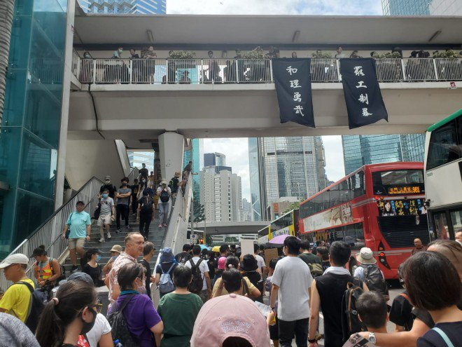 #LIVE: Two black banners are seen hanging on the footbridge from Arsenal House in Wan Chai. They call for a strike in September to "fight tyranny". http://sc.mp/3nrqw #hongkongprotestspic.twitter.com/pYfyFcXrNV